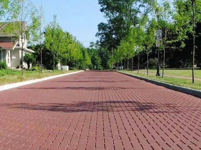 真空路面磚是天然陶土經大型真空機擠出成型,經鋼絲拉面制成,色彩自然,永不褪色,致密性很好,強度超高
